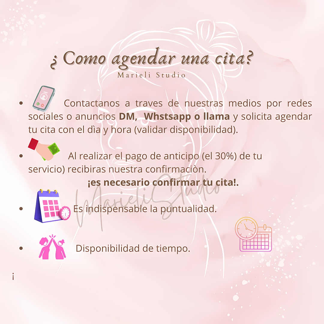 Agendar, para agendar tu cita es necesario validar disponibilidad de horario, deberás cubrir el 25% del servicio como anticipo para asegurar tu lugar en nuestra agenda, este no es reembolsable en caso de cancelación o faltar a tu cita.